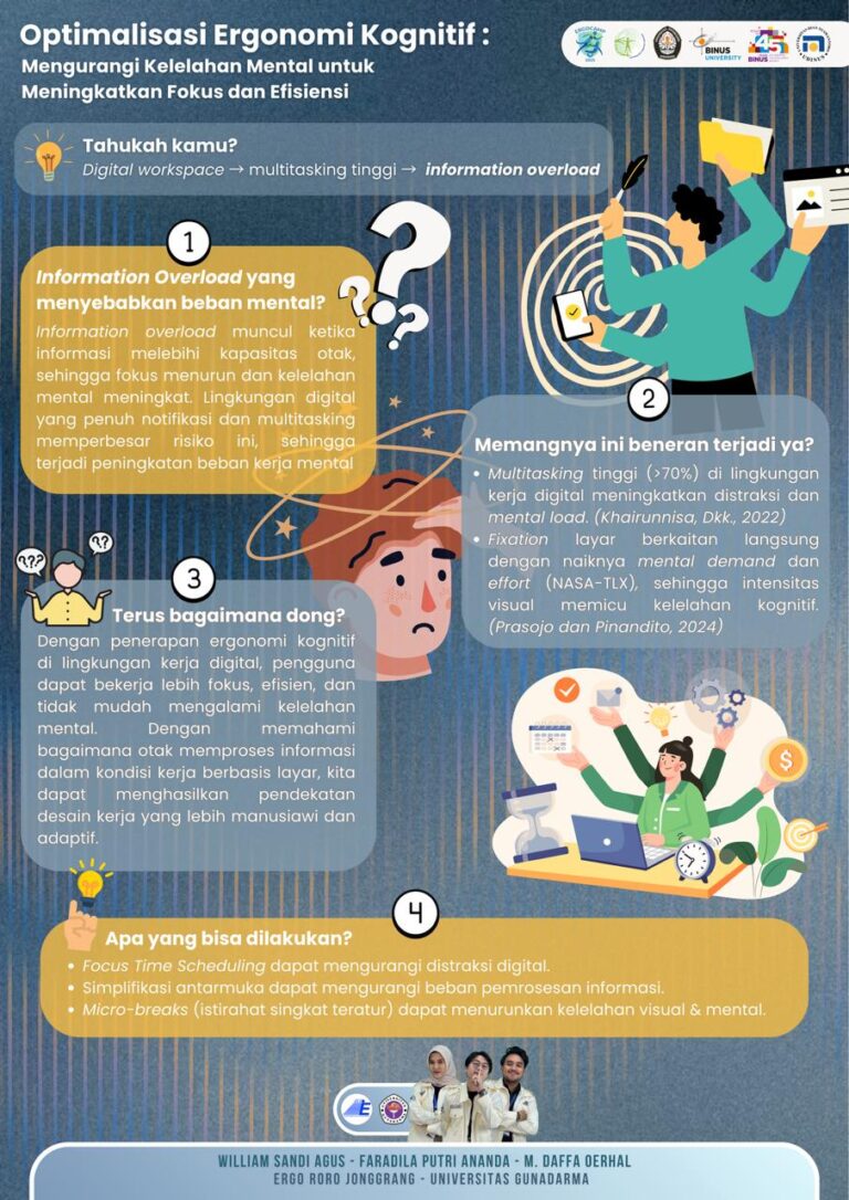 Selain itu, peserta mengikuti sesi pemungutan suara untuk menilai poster ilmiah yang telah dibuat sebelum kegiatan ERGOCAMP 2025 berlangsung. Tim Ergo Roro Jonggrang mengangkat tema mengenai Ergonomi Kognitif dengan judul “Optimalisasi Ergonomi Kognitif: Mengurangi Kelelahan Mental untuk Meningkatkan Fokus dan Efisiensi”. Poster yang dibuat berfokus pada pengaturan cara kerja agar tidak menimbulkan kelelahan mental dan tetap menjaga tingkat fokus. Melalui tema ini, tim Ergo Roro Jonggrang menegaskan bahwa efektivitas kerja tidak hanya bergantung pada desain produk yang ergonomis, tetapi juga pada bagaimana sistem kerja dirancang agar sesuai dengan kapasitas kognitif manusia. Poster tersebut juga membahas mengenai bahaya information overload. Information overload adalah situasi ketika beban informasi melebihi kemampuan otak untuk memprosesnya sehingga dapat memicu kelelahan mental dan menurunkan performa. Tim Ergo Roro Jonggrang memberikan solusi dengan pendekatan ergonomi kognitif, seperti penerapan focus time scheduling, simplikasi antarmuka, serta micro-breaks yang dapat membantu pekerja menjaga konsentrasi dan mengelola beban mental secara lebih sehat dan efektif.
