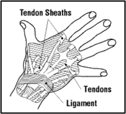 Terdapat pada tangan dan pergelangan. Gerakan berulang dapat mengganggu pelumasan tendon, sehingga terjadi gesekan yang menyebabkan peradangan dan pembengkakan (tenosinovitis).
